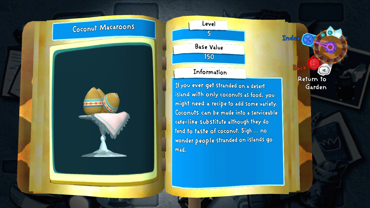 Coconut Macaroons are a produce item introduced in Viva Piñata: Trouble in Paradise that can be created by Bart by using a coconut.