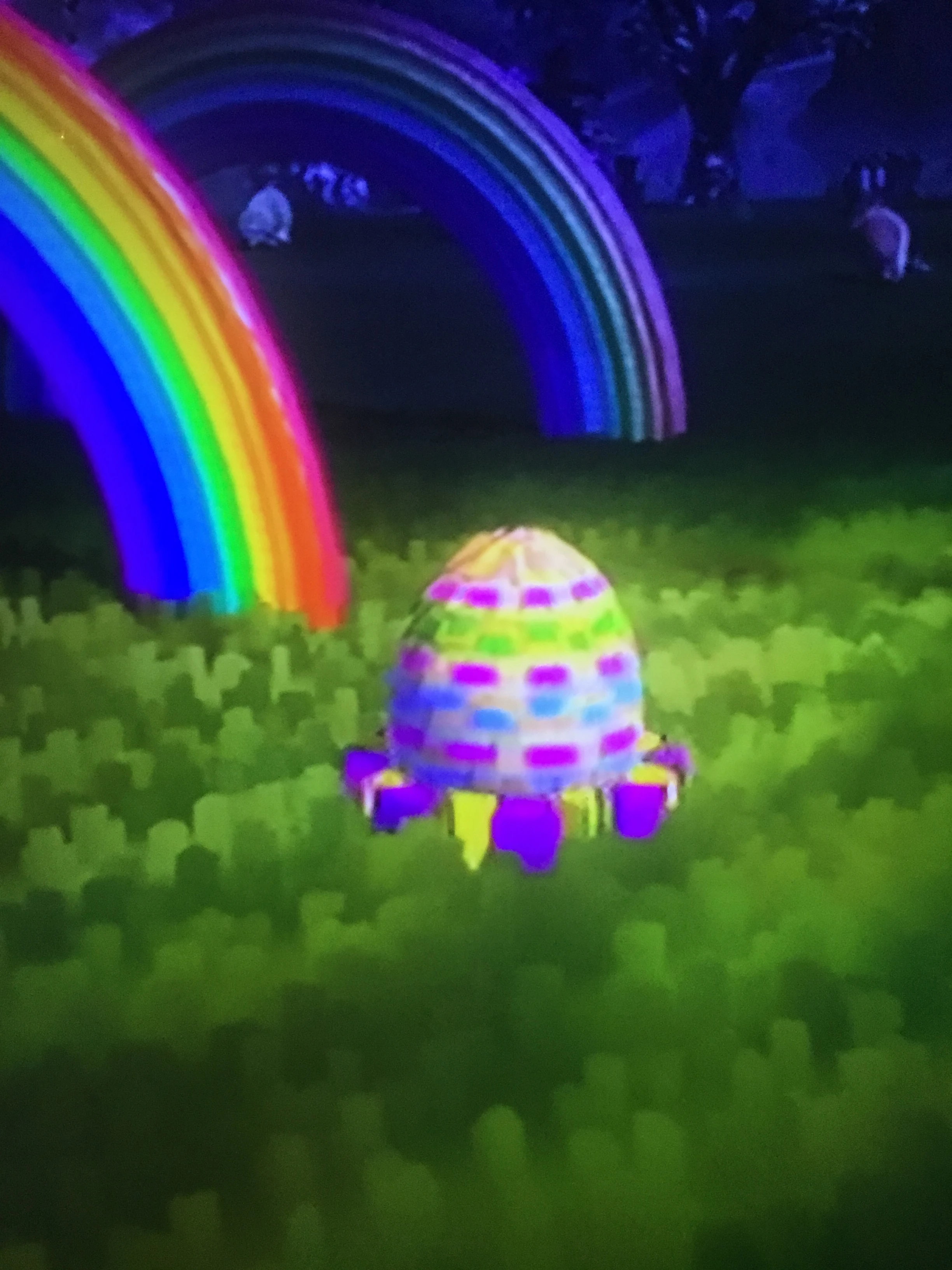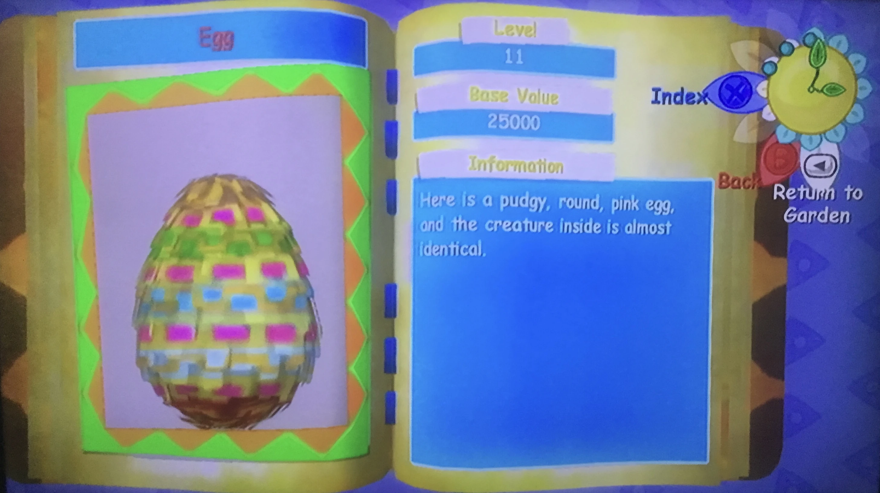 The Egg is the same size as any other piñata Egg. It is mostly yellow and tan, with pink, green, and blue patterns all around. Like all other Eggs, it is fuzzy.