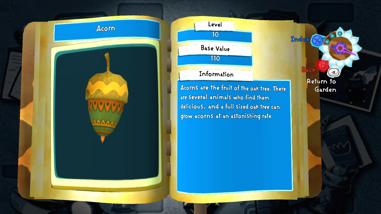 Acorn | Acorns are the fruit of the oak tree. There are several animals who find them delicious, and a full sized oak tree can grow acorns at an astonishing rate. | 10 | 110 | Oak Tree |