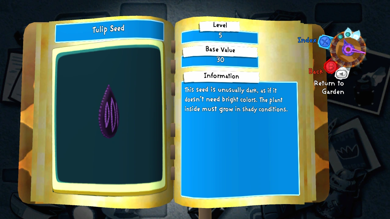 The Tulip Seed is a dark purple seed that grows into a tulip flower.